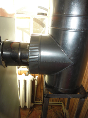 На фото изображена камера загрузки. Вверху расположен дымовой канал (водяная рубашка), который не дает избыточному теплу